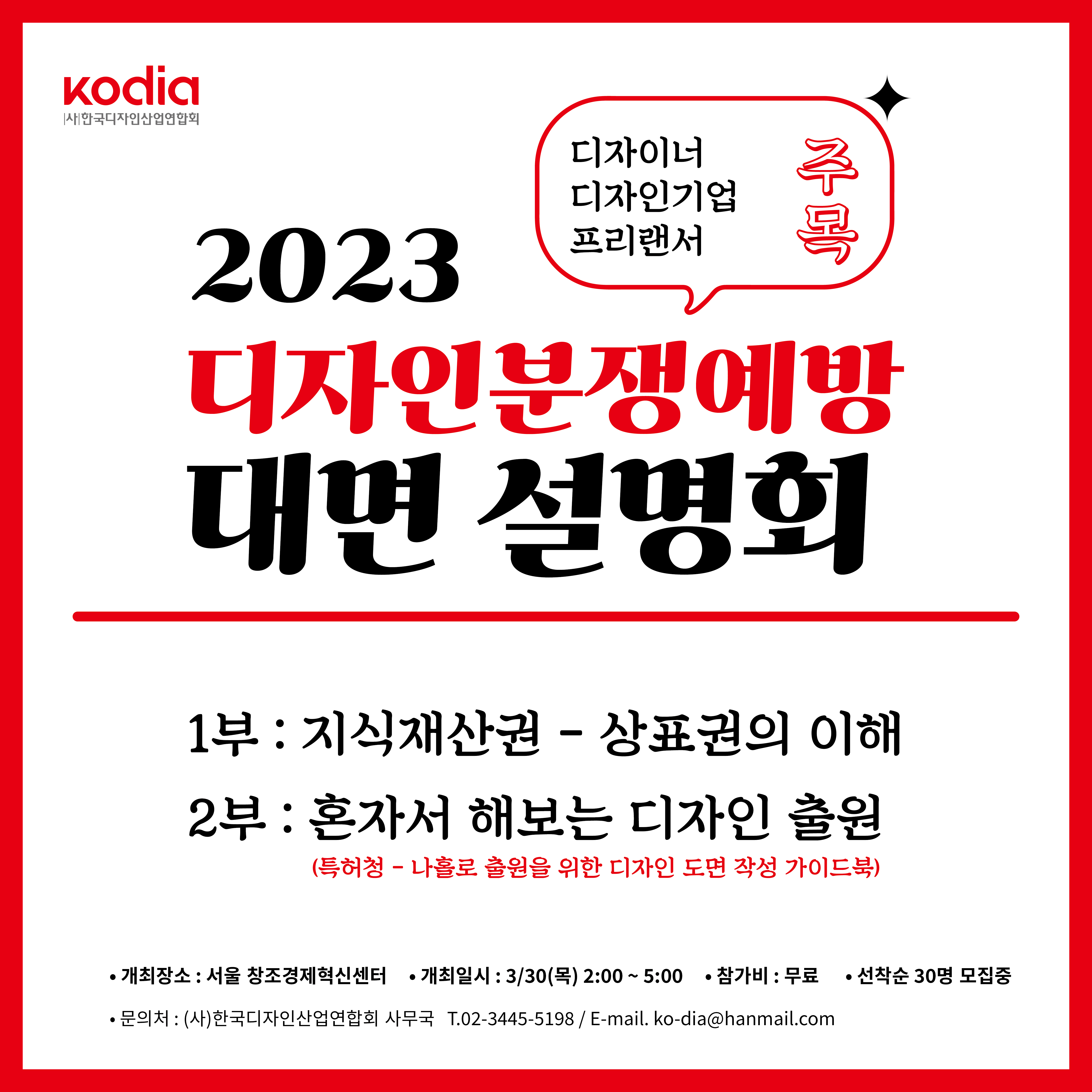 | 제목 | 「2023 디자인 분쟁예방 설명회」개최 안내(상반기) | ||